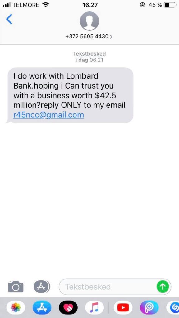 Der er ikke nogen, der har 42,5 mio. dollars stående på en konto, som de gerne vil overføre til dig – og selv hvis der var tilfældet, så ville de nok ikke henvende sig på SMS eller i en kortfattet e-mail.
