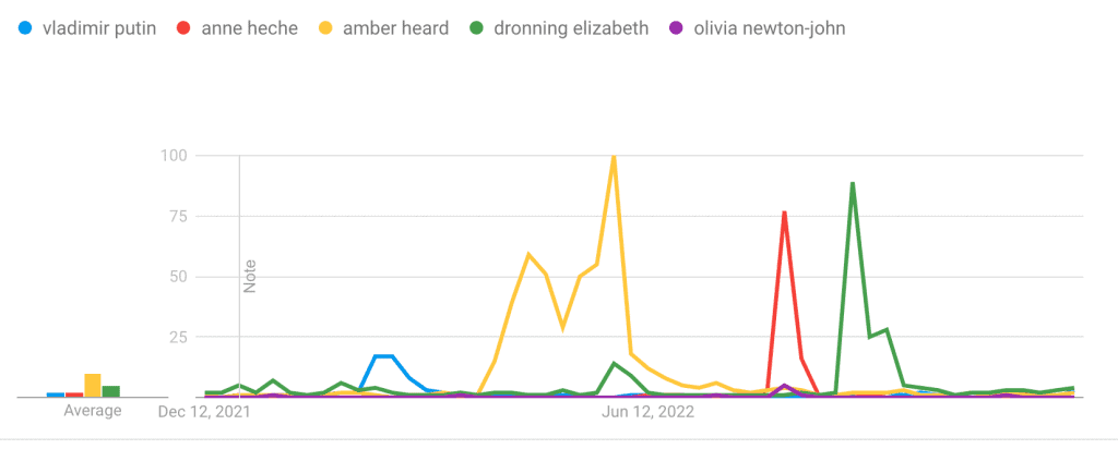 Olivia Newton-John fuldender top 5, som ligesom Anne Heche og Amber Heard var en skuespillerinde, der gik bort i 2022. Hermed understreger det også, at en overvægt at top 5 søgninger på udlændinge har været baseret på deres død.