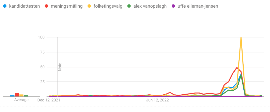 Sådan her så det ud i løbet af året, hvor søgningerne er af gode grunde samlet omkring valget (på de nøjagtige søgninger og ikke emnet som helhed):