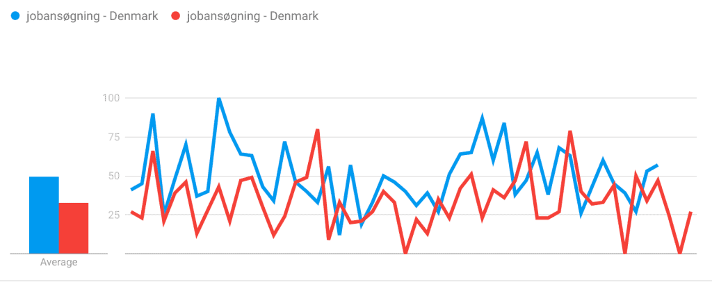 I 2022 blev der derfor søgt 51,52% mere på "jobansøgning" end året forinden. Dette understreger de udfordringer mange danskere har haft, samt søgen på at komme tilbage på arbejdsmarkedet.