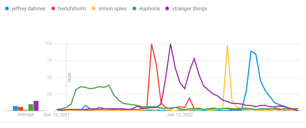Baseret på top 3 er det primært de mere dystre og autentiske historier, som har fanget danskernes interesse. Dette følges af store serier som Euphoria og Stranger Things. Ja generelt har serier i højere grad fået publikum end filmene har.