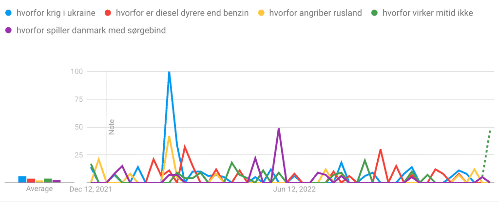 Top 3 på de mest trendende søgninger udgøres af "hvorfor krig i ukraine", "hvorfor er diesel dyrere end benzin" og "hvorfor angriber rusland". Søgninger der både er relateret til krig og inflation.