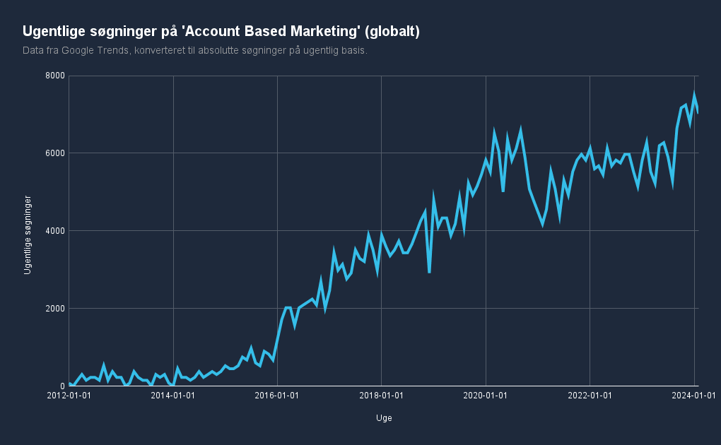 Nedenfor ses de månedlige globale søgninger på Account Based Marketing over årene, og her er det også tydeligt at det siden 2015 kun er gået en vej ift. Efterspørgslen og nysgerrigheden.
