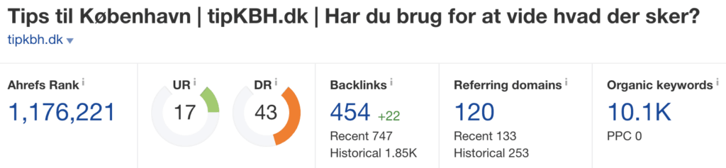 I modsætning til mange andre sider, så har tipKBH på eksemplet nedenfor “kun” 454 backlinks, og det er mere end nok til at få et super stærkt domæne.