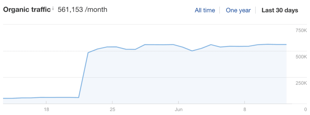 For at fremhæve et andet eksempel, kan vi i nedenstående eksempel også se en klar korrelation i udviklingen på links over en måned sammenlignet med udviklingen i organisk trafik for Artland.com: