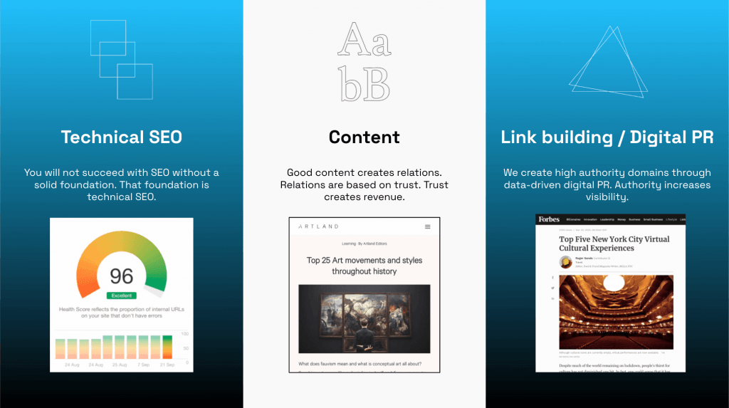To rank among the top search results on Google, you need to beat your competitors in three disciplines: Technical SEO, Content and Link building.
