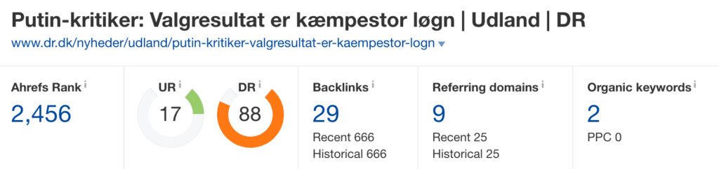 Der er nemlig ikke tale om en nyhedsartikel, men en emneside om Vladimir Putin, der linker videre til de nyeste artikler om den russiske præsident. Emnesiden har ingen backlinks, men har eksistereret siden i hvert fald 2015. Det er grænsen for Ahrefs’ egen dataindsamling.