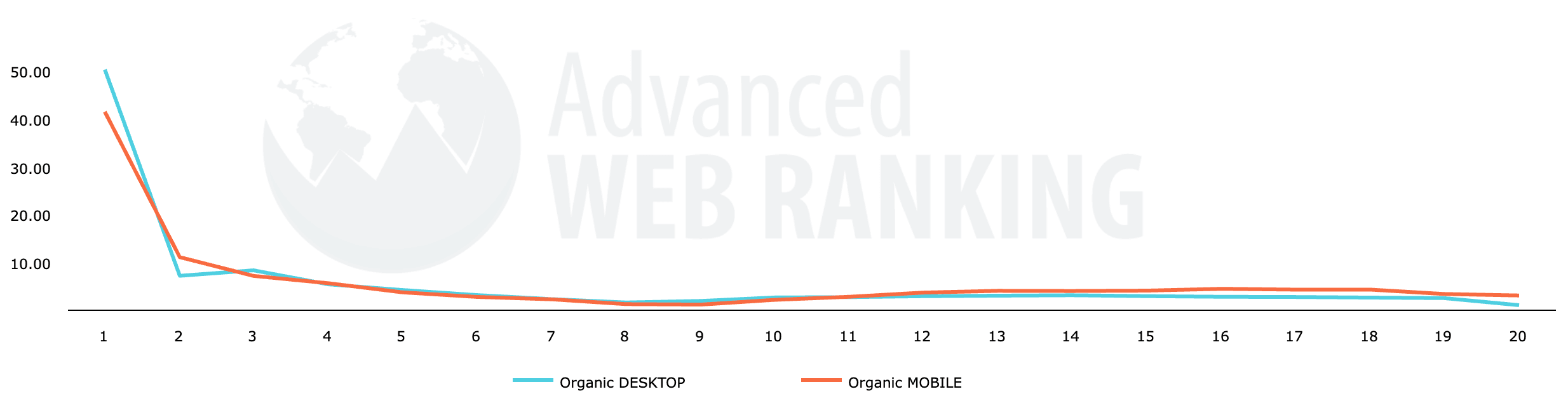 Enligt Advanced Web Ranking (Januari 2026) får sökresultatet med första placeringen på Google organiska resultat i genomsnitt 50,13% av trafiken från datorer, och 41,34% av trafiken från mobiltelefoner. Därefter är kurvan brant och trafiken minskar kraftigt.