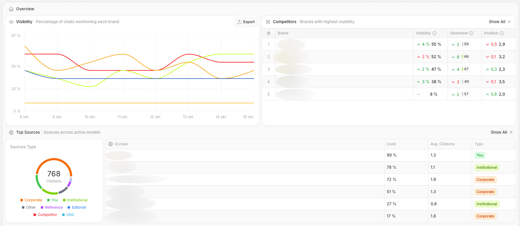 Omnämnanden och citeringar: När och hur ofta nämner AI-modellerna ditt varumärke eller citerar innehåll från din hemsida?